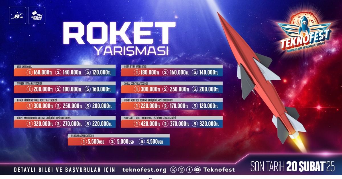 Roket Kontrol Bölümü Geliştirilmesi Kategorisinde toplam 510 bin TL, Hibrit Yakıtlı Roket Motoru Geliştirme Kategorisinde toplam 810 bin TL ve Sıvı Yakıtlı Roket Motoru Geliştirilmesi Kategorisinde ise toplam 1 milyon 110 bin TL para ödülü verilecek. Yarışmaya başvurular 20 Şubat’a kadar www.teknofest.org web sitesi üzerinden yapılabilecek.